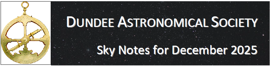 New Moon is on the early morning of Saturday December 20th, and the young crescent Moon will reappear low in the south-west after sunset from Monday 22nd onwards. On Boxing Day evening, Friday 26th, the broad crescent Moon will sit about 4o to the right of the planet Saturn.