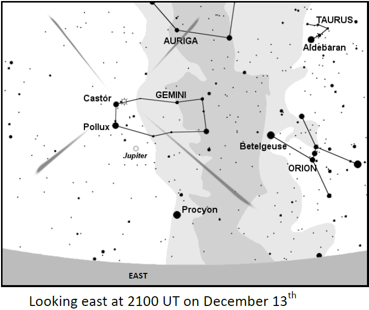 The annual Geminid meteor shower is one of the year’s most reliable, regularly producing observed rates of 50-60 meteors per hour at its maximum, which this year falls around dawn on the morning of Sunday December 14th. Highest rates will therefore be seen overnight from Saturday 13th into the 14th; the Moon is a waning crescent and doesn’t rise until 0230 UT so interference from moonlight will be minimal.