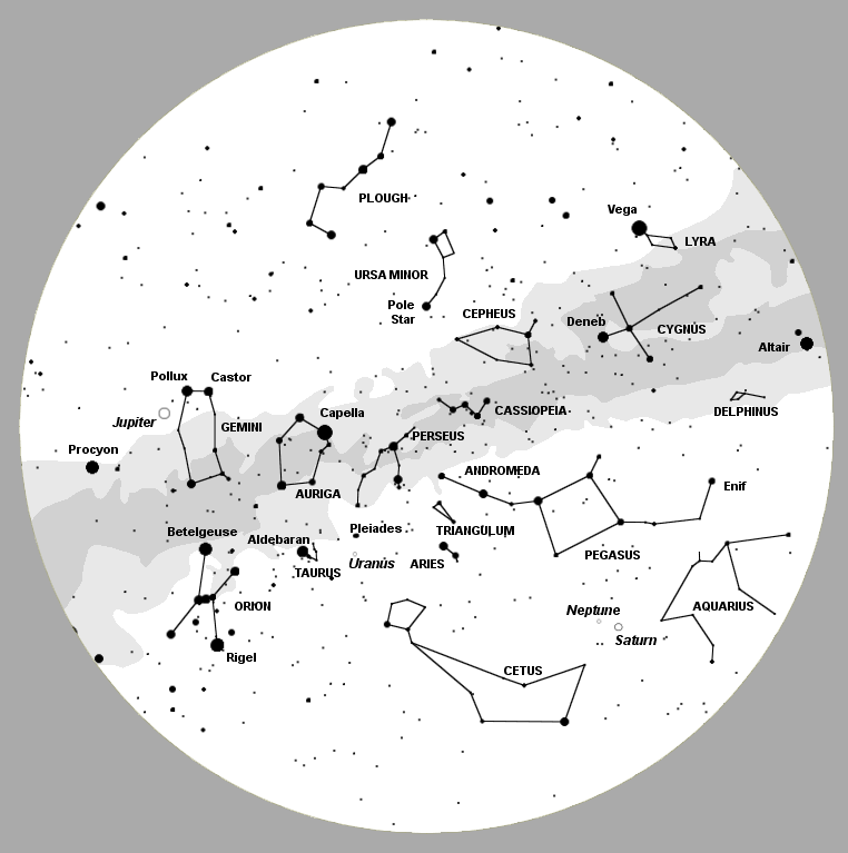 The Milky Way crosses overhead from south-east to north-west, running through Gemini, Orion and Auriga into Perseus and Cassiopeia and down through Cygnus. Moonless winter evenings are ideal for exploring the many clusters and starfields that lie along the extent of the Milky Way.