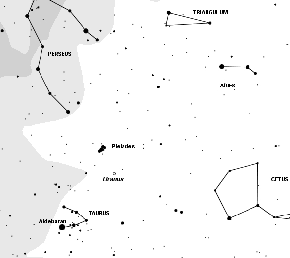 Uranus is at opposition on November 21st, and will be at its brightest this month. It can easily be found in binoculars, appearing as a faint ‘star’ in the western part of the constellation of Taurus, to the lower right of the Pleiades. The finder chart on the right is an enlarged section of the all-sky map below, and shows stars to around the same brightness as Uranus. If followed over the course of the month, the planet’s slowly changing position against the background stars will be noticed as it moves from east to west across the sky (the position of Uranus on the chart is shown for mid-month).