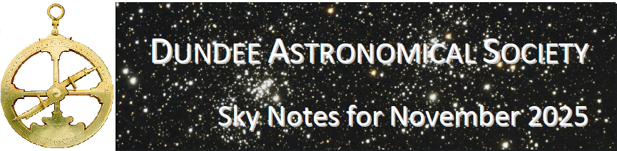 Comet C/2025 A6 Lemmon remains an easy binocular object in early November at around magnitude 4; however it is now travelling southwards and will be difficult to spot from Scottish latitudes by about the middle of the month. The finder chart which was included in last month’s Sky Notes is reproduced below, showing the position of the comet until November 7th.